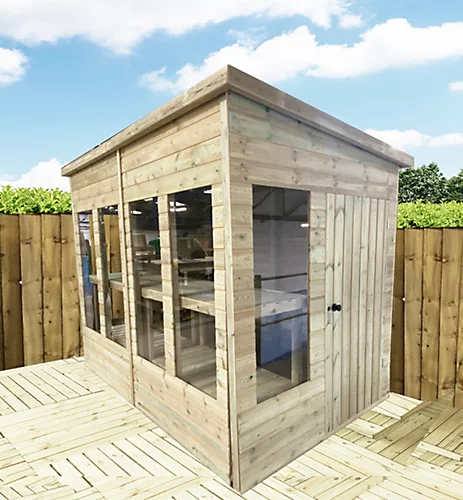 This Fully Pressure Treated Pent Summerhouse comes with a Single Door; 12mm Pressure Treated Shiplap Tongue and Grove Cladding; 38mm x 63mm Planed Rounded Framing. The Summerhouse comes with 12mm Tongue and Groove Floors and Roof as standard and Premier Mineral Roofing Felt and Full Fixing Kit and instructions. The Summerhouse comes as standard with 4mm Toughened Safety Glass and a Rim Lock and Key.