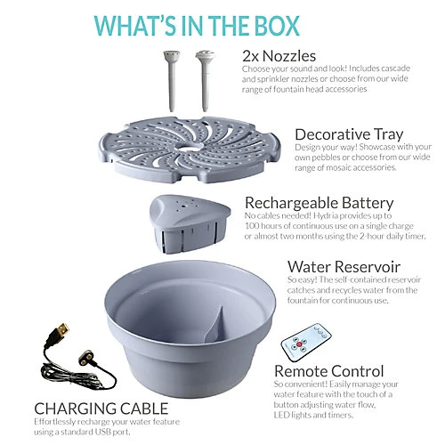 - Comes with a gift box – cascade and sprinkler fountainheads – display plate – water pool – rechargeable water pump – cleaning & maintenance kit – instructions .