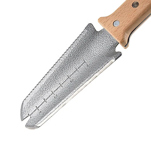 - Twin blades for sliding around the inside of a pot to release a plant before transplanting, or slicing through tangled roots with the serrated blade