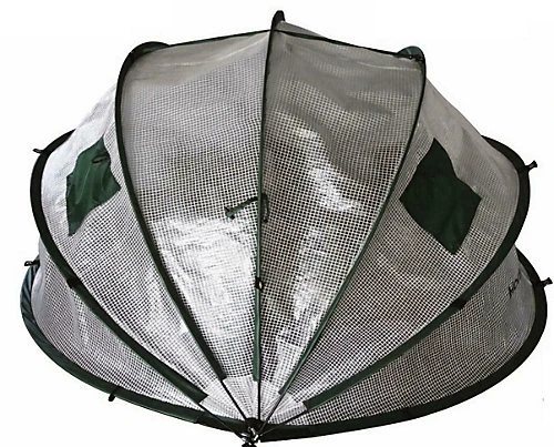The HortiHood Mini 180 º small greenhouse is free standing with loops around the edge to peg it down and, as with our other similar models, full access is easy with the simple lift-up/drop-down action.
