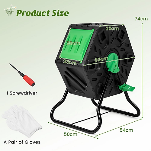 - Features: Tumbling design helps to speed up the fermentation process Convenient stopper can flexibly lock and unlock the rotation Multiple air holes facilitate fermentation PP material is weather-resistant and no odor Rustproof metal legs ensure stable standing Sliding door is easy to open and can avoid small animals Suitable for balcony, porch and garden with compact size Kitchen garbage can be turned into compost for a recycled kitchen Equipped with a pair of gloves and screwdriver for easy assembly Specifications: Color: Black + Green Material: PP + Metal Overall Size: 60 cm x 50 cm x 74 cm (L x W x H) Diameter of Barrel: 60 cm Barrel Width: 29 cm Capacity of Barrel: 65 L Net Weight: 5 kg Package includes: 1 x Single Chamber Compost Tumbler 1 x A Pair of Gloves 1 x Screwdriver 1 x Instruction