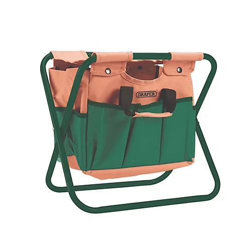 This portable folding chair has a detachable tool bag with lots of storage space, making it ideal for use while gardening, fishing, camping and other outdoor activities. It has a sturdy steel frame for extra strength and can support up to 110kg. The seat and detachable bag are made from thick Oxford fabric, which is exceptionally hardwearing. The bag has two carry handles and eight organiser pockets, perfect for storing tools and equipment. It is easily removed and reattached to the stool using the snap-type pop stud fasteners.