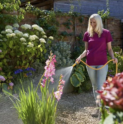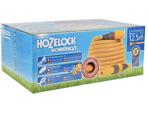 This Wonderhoze expandable hose from Hozelock adds efficiency and quality to your work and makes your daily routine easier. Elastic inner liner: The ultra-elastic inner layer of natural rubber prevents the hose from tearing or bursting. Practical design: The remaining water in the hose can be easily emptied and put to good use by turning the garden sprayer at the desired location in the garden, after which the outdoor hose empties and shrinks to its original size. Long hose: This hose is 12.5 metres long, ideal for small gardens, patios, terraces or balconies. Plus, this garden hose comes complete with fittings, including a universal tap fitting and an adjustable garden sprayer. Specifications Colour: Yellow Material: PVC, fabric Length: 12.5 m Hose diameter: 1.6 cm Expands to 3x its own length Soft fabric outer layer Lightweight Delivery contains: 1 x Nozzle 1 x 1/2″ Tap connector 1 x 3/4″ Tap connector 2 x Coupling with water stop EAN:5010646064217