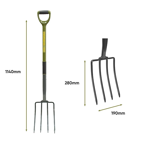 - Carbon steel hardened and tempered fork head with re-enforced shaft and handle