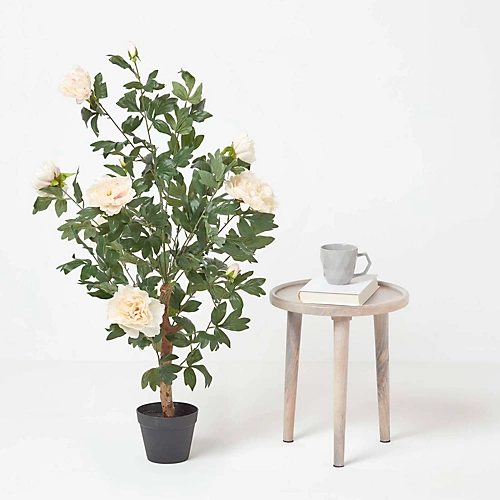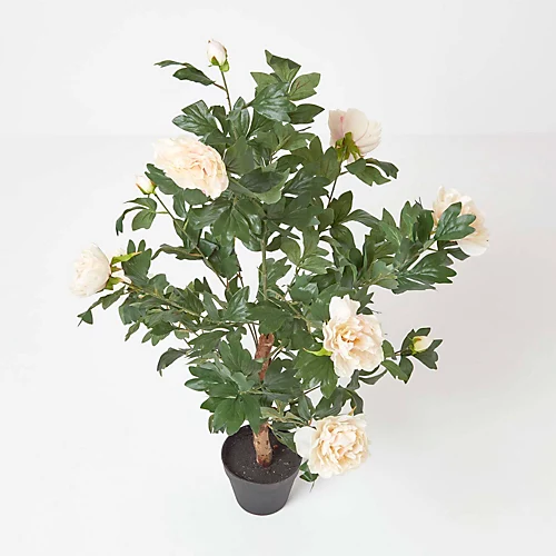 - Artificial Peony Tree from Homescapes featuring peach peonies set inside its own black plastic pot. Measuring approximately 100 cm. Colour: Peach.