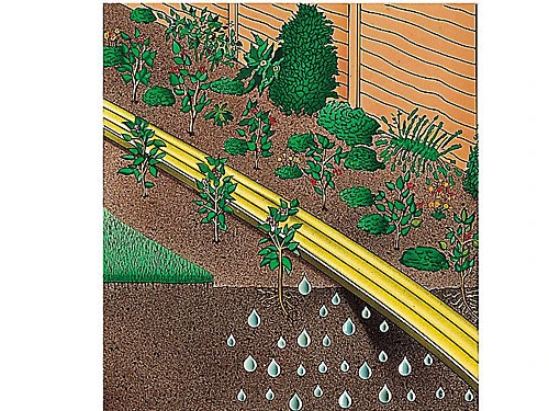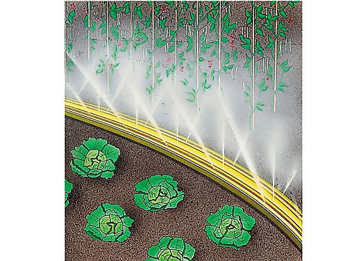 A 2-in-1 perforated flat hose which produces a gentle sprinkler effect when used upright and a deep soaking action when reversed.