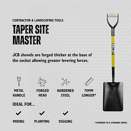 - Developed for use in the toughest of conditions, the JCB Professional Solid Forged Shovel No2 Taper Mouth (Site Master) is designed mainly for shovelling tasks such as mixing, moving aggregate, soil, sand, cement, industrial waste, farmyard waste and debris.