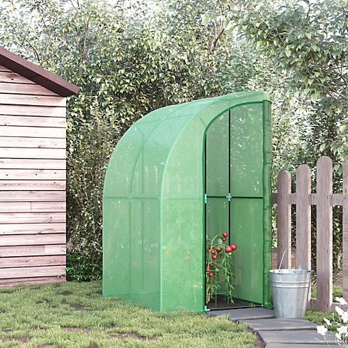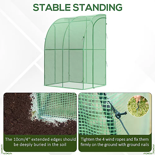 – Perfect for plants, vegetables and flowers; – Leaning design to stand steady against walls and garages; – Zippered roll up door for easy access in and out; – Plastic cover to protect against mild wind and light rain; – Steel frame for a reliable structure; – Guy ropes included to pin to the ground;