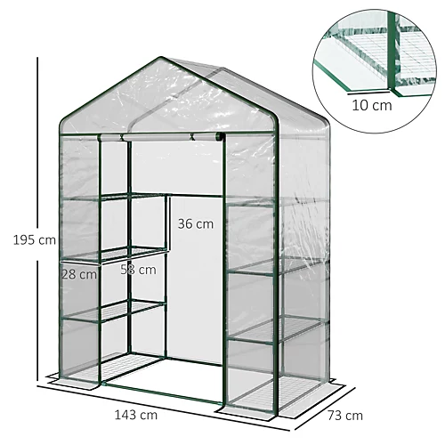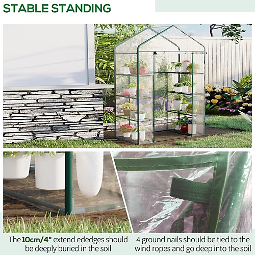 -Constructed of high-quality metal frame in strong and stable build for long time use ; – Walk In style greenhouse ;-There are 4 shelves organizing flower pots on internal 2 sides; -It will protect vegetables from cold winter and frost; -With 4 pull ropes and 4 ground nails for stable fixation on ground ;-Cover with transparent PVC membrane for protecting plants from pests and birds; -Suitable for displaying seedlings, storing plants and growing shrubs; -Door can be rolled up, the zipper is added for smooth opening and close;