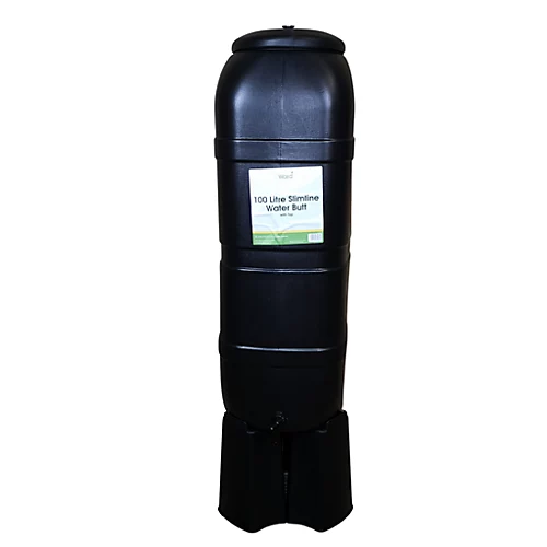 Outdoor garden water butt in black with a spacesaving design, filter and stand kit and 100 litre capactity